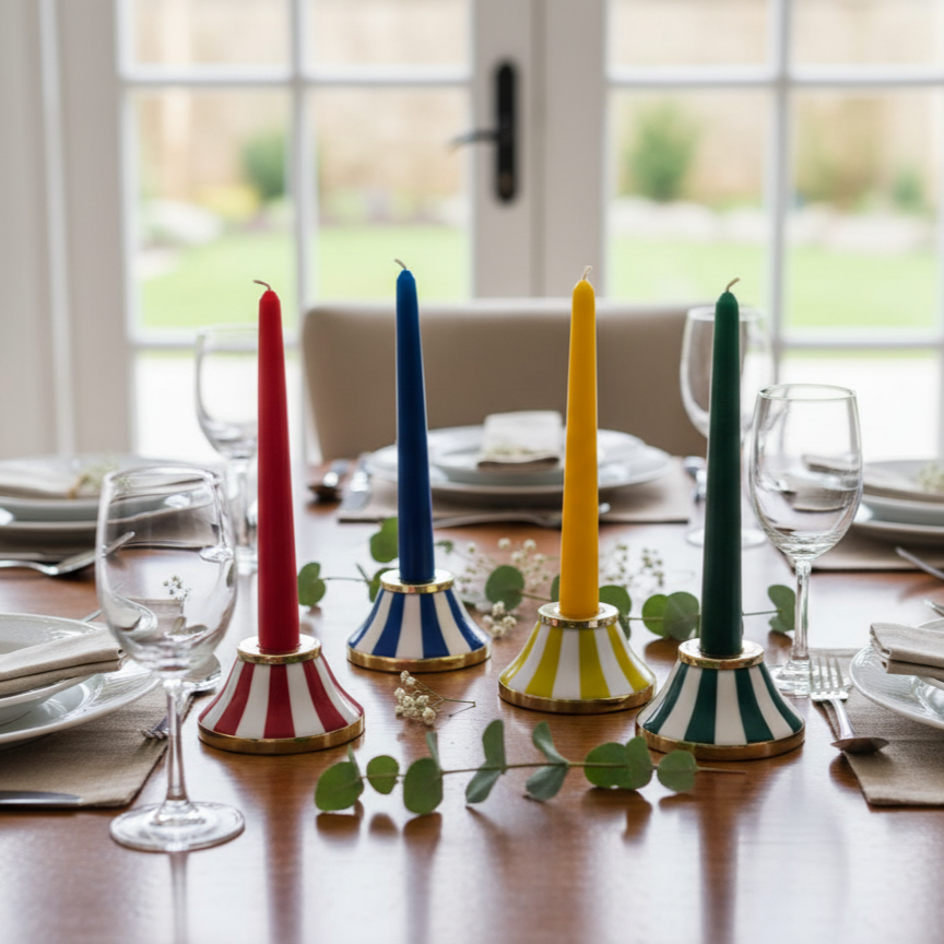 Bringen Sie mit diesem bezaubernden Kerzenhalter-Set Farbe und Verspieltheit in Ihr Zuhause. Die kunstvoll gearbeiteten Kerzenhalter sind ein absoluter Blickfang auf jedem Tisch. Inspiriert von der klassischen Figur aus der Commedia dell'arte, verleiht das farbenfrohe Streifenmuster jedem Raum eine fröhliche und elegante Note. Die goldenen Akzente aus Messing an der Ober- und Unterseite runden das Design stilvoll ab. Dieses Set besteht aus vier Kerzenhaltern in den Farben Rot, Blau, Gelb und Grün, die sich perfekt kombinieren lassen.
