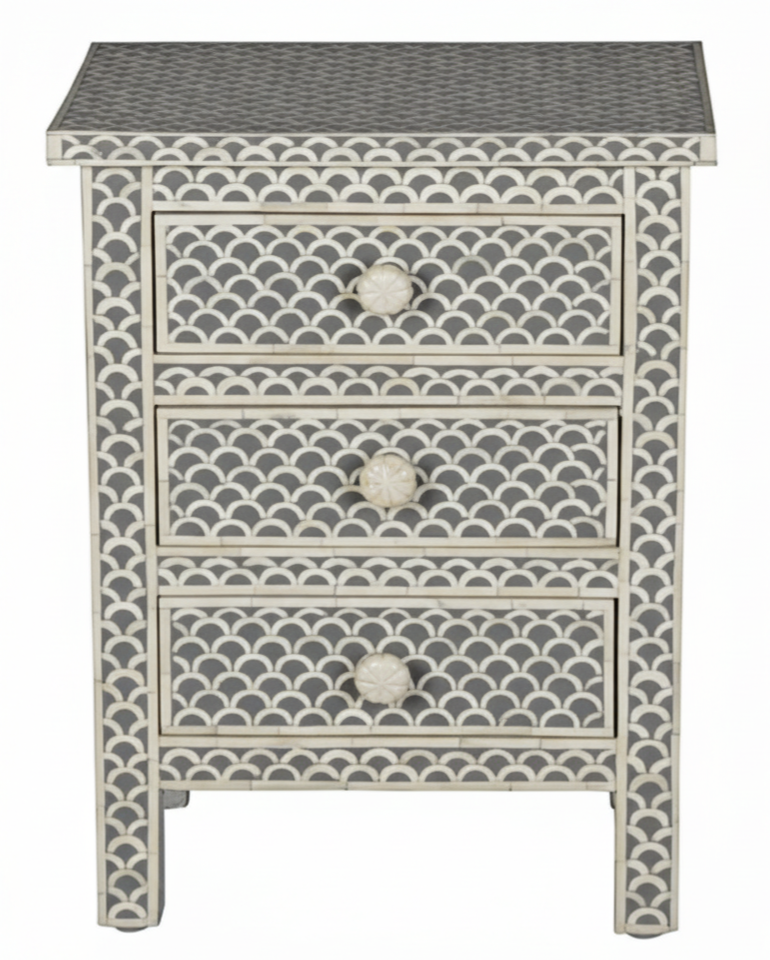 Der exquisite Nachttisch "FISH" aus Bone Inlay ist ein wahres Schmuckstück für Ihr Schlafzimmer. Das geometrische Fischschuppen-Muster in verschiedenen Farben verleiht dem Nachttisch eine moderne und zugleich elegante Optik. Die handgefertigte Intarsienarbeit schafft zudem eine einzigartige Tiefe und Struktur.