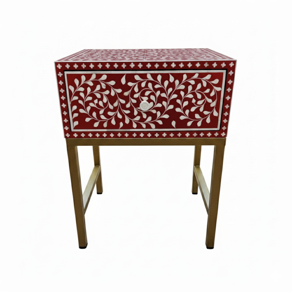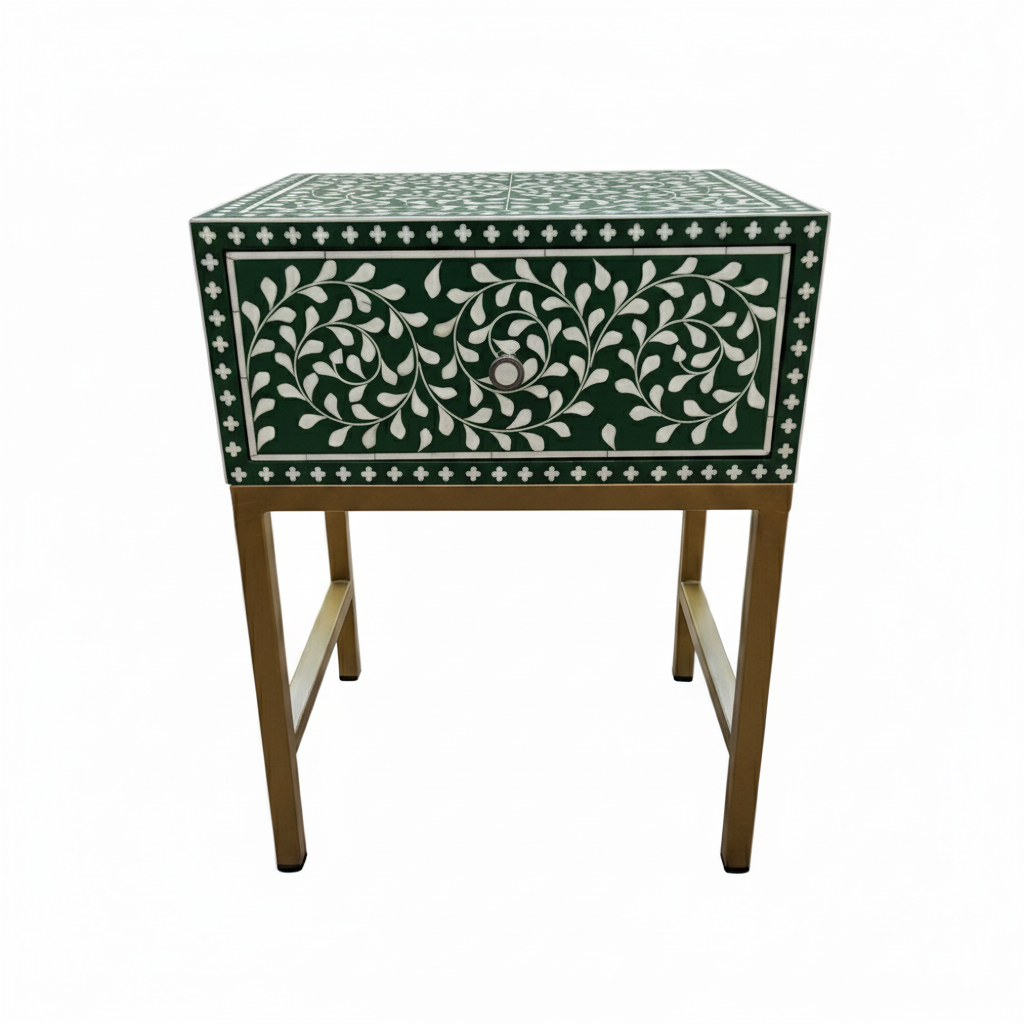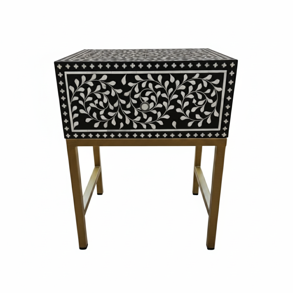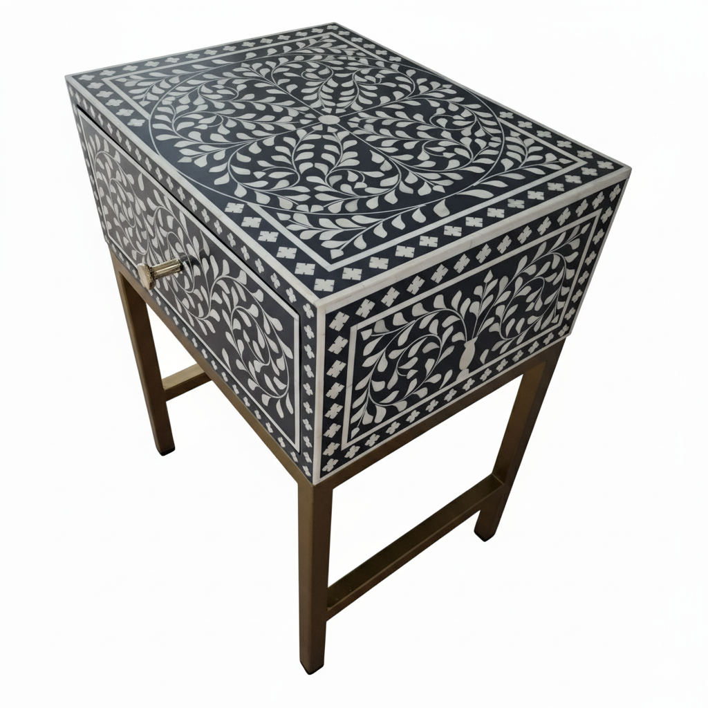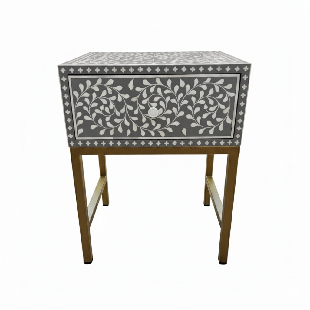 Der Nachttisch "Puri" ist ein wahres Schmuckstück und vereint traditionelles Handwerk mit modernem Design. Das zarte, florale Muster in Weiß auf einem grauen Hintergrund verleiht dem Nachttisch eine einzigartige Tiefe und einen luxuriösen Glanz. Die handgefertigte Intarsienarbeit erinnert an blühende Zweige und schafft eine harmonische Atmosphäre. Die Kombination aus der natürlichen Schönheit des Bone Inlays, dem eleganten floralen Muster und den grazilen goldenen Metallbeinen verleiht dem Nachttisch einen Hauch von Glamour.