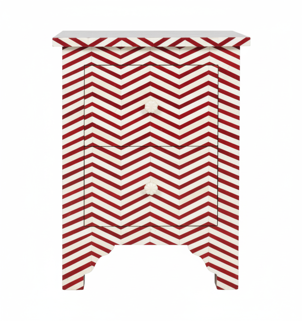 Dieser Nachttisch ist ein echter Hingucker und vereint modernes Design mit traditionellen Handwerkstechniken. Das geometrische Zickzack-Muster, u.a. in Schwarz und Weiß, erinnert an die eleganten Linien des Art-Deco-Stils. Die zwei Schubladen bieten ausreichend Raum und Fläche für Bücher, Lampen oder andere persönliche Gegenstände.