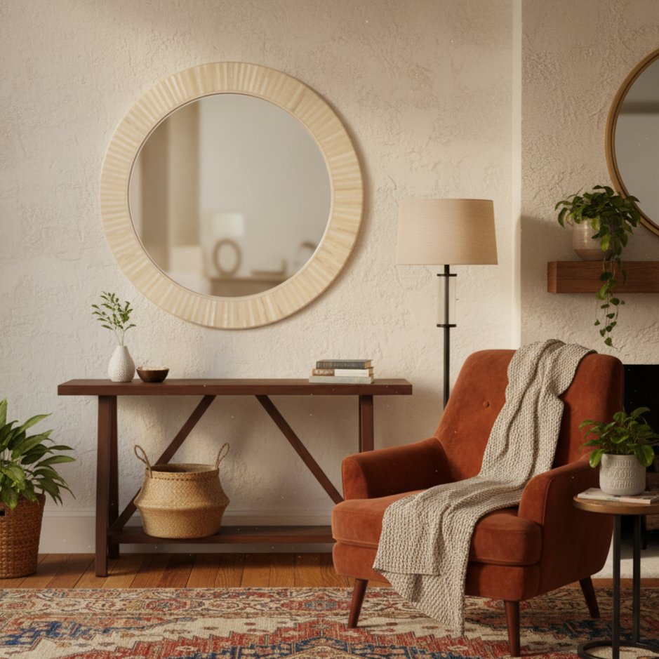 Wohnzimmer: Hängen Sie den Spiegel über ein Sofa oder eine Kommode, um einen eleganten Akzent zu setzen.